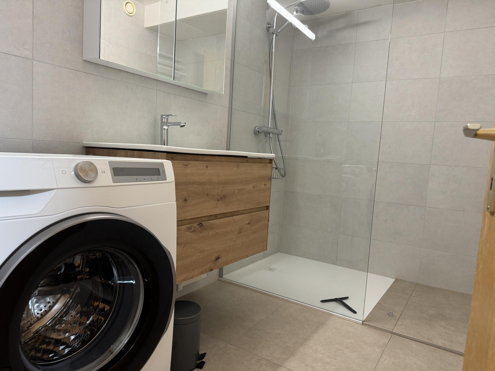 La salle de bains est équipée d’une douche et une machine à laver, avec des toilettes séparées.